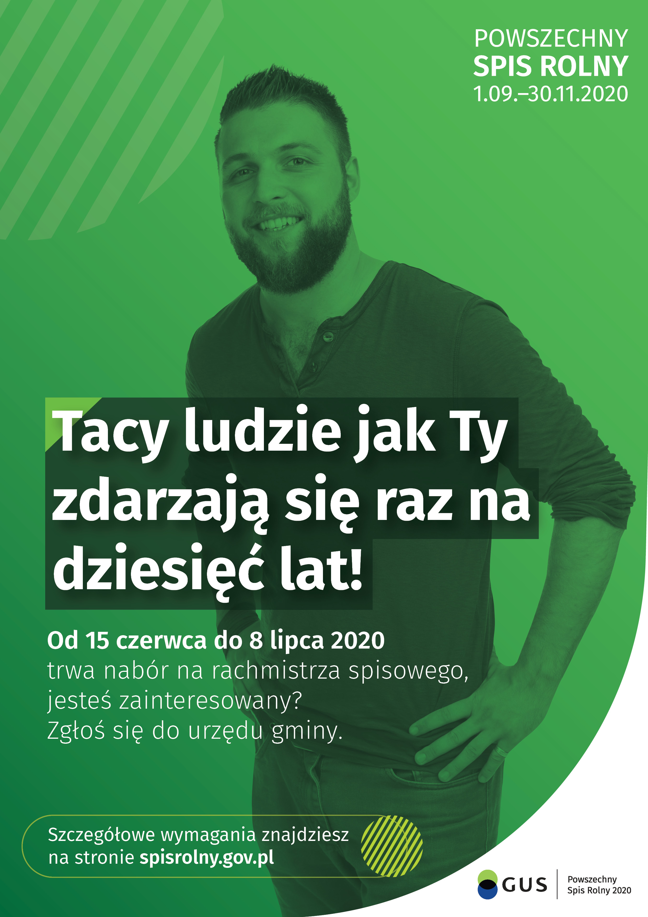 - Informacja o otwartym i konkurencyjnym naborze kandydatów na rachmistrzów terenowych do Powszechnego Spisu Rolnego w 2020r.pdf; klauzula RODO.docx; załącznik nr 1i2.docx; załącznik nr 3.docx; plakat.jpg; plakat1.pdf